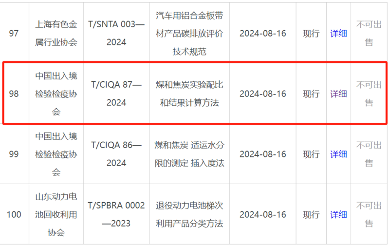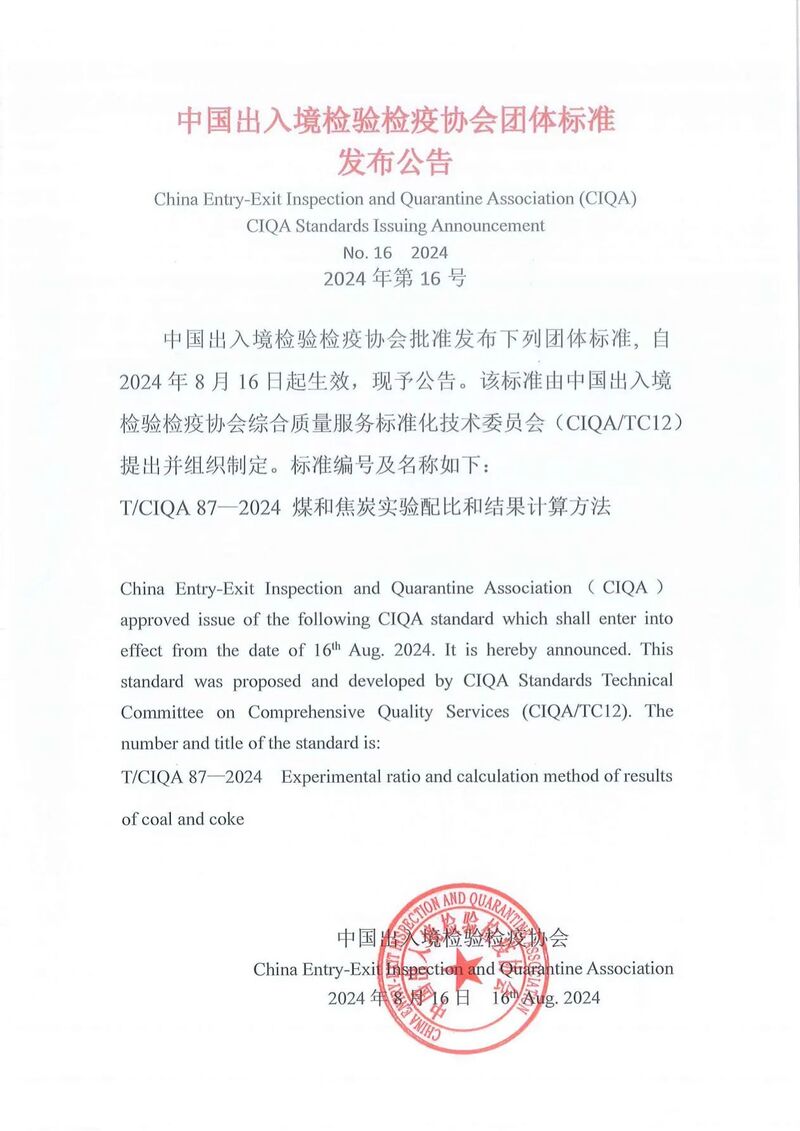 8月16日,中国出入境检验检疫协会发布2024年第16号公告,中国中检河北公司所属唐山港分公司牵头编制的T/CIQA87-2024《煤和焦炭实验配比和结果计算方法》团体标准获批,于2024年8月16 日正式实施。该标准有效填补了国内外对煤和焦炭样品配比及品质指标结果计算领域的空白,为贸易相关方提供了重要的参考依据,为煤炭市场发展和贸易提供重要技术和标准支撑。