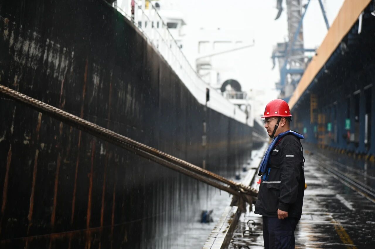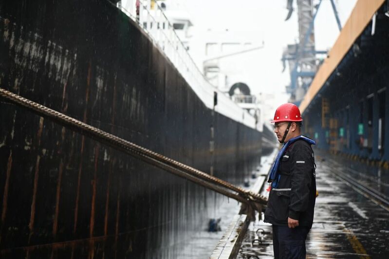 气温骤降,检验员们依然早早守候在泊位处,开展水尺计重业务,他们全神贯注于波浪间细微的毫米刻度,这份专注,是寒风也无法阻挡的责任与热忱。