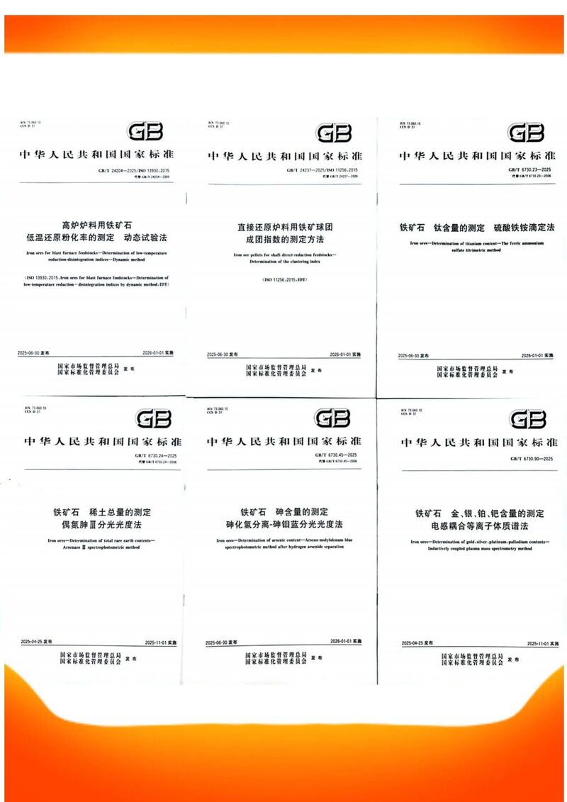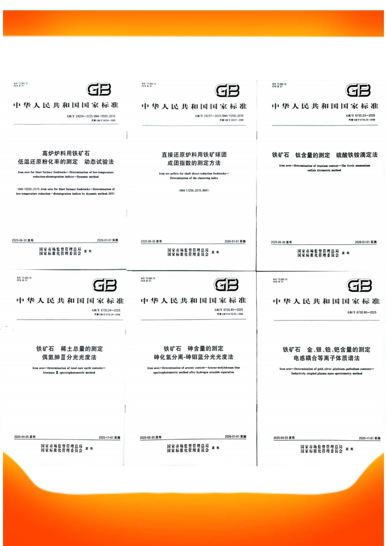 此次参与制修订的标准涵盖了从高炉炉料到直接还原新工艺的原料评价,从常规成分到有害元素及稀贵金属的检测,具体包括;《GB/T 24237-2025 直接还原炉料用铁矿球团 成团指数的测定方法》、《GB/T 24204-2025 高炉炉料用铁矿石 低温还原粉化率的测定 动态试验法》、《GB/T 6730.45-2025 铁矿石 砷含量的测定 砷化氢分离—砷钼蓝分光光度法》、《GB/T 6730.23-2025 铁矿石 钛含量的测定 硫酸铁铵滴定法》、《GB/T 6730.24-2025 铁矿石 稀土总量的测定 偶氮胂Ⅲ分光光度法》的修订和《GB/T 6730.90-2025 铁矿石 金、银、铂、钯含量的测定 电感耦合等离子体质谱法》的制定。